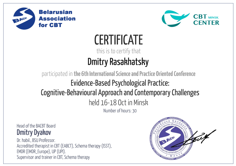 16-18 октября 2025, Минск – “Научно обоснованная практика психологической помощи: когнитивно-поведенческий подход и вызовы современности”. VI международная научно-практическая конференция, при информационной поддержке Европейской ассоциации КПТ (EABCT). Спикеры конференции: Джудит Бек, Стивен Хейс, Роберт Лихи, Пол Гилберт, Кэти Грейзбрук, Кейт Добсон, Екатерина Винник и др.